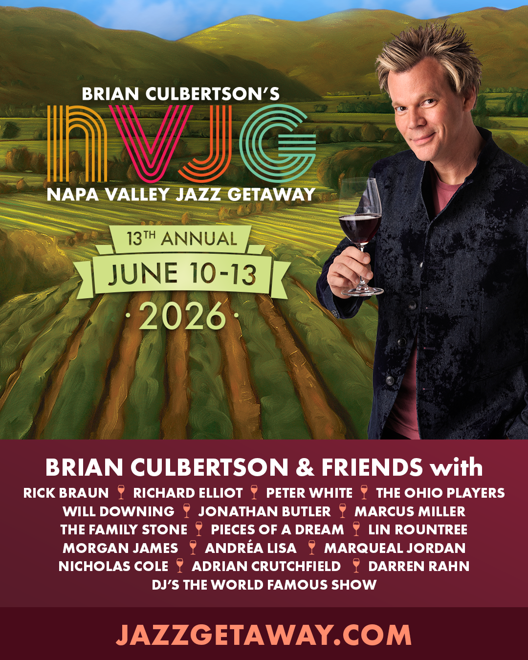 The Napa Valley Jazz Getaway is entering its' 13th year June 10 - 13, 2026. It has become the West Coast's ultimate smooth jazz destination, and the party of the summer.